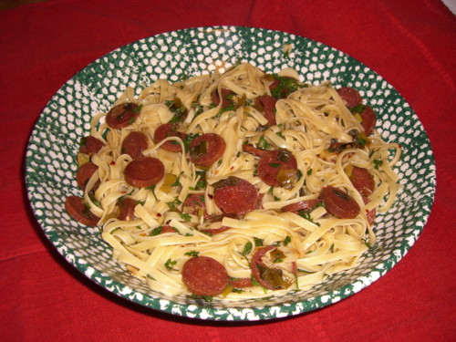 It was in this spirit that a year or two ago I said to wife Geri, “I’ve never heard of a pasta recipe with pepperoni. Maybe there is one out there but I never heard of it.” I was familiar with pepperoni and eggs as a late night-early/wee hours/morning treat from my youth and decades ago with my crony friends. But pasta and pepperoni? – -Never! And why not? “There should be some kind of recipe like that, basic and simple,” I continued. And as with similar “brainstorms” over the years, Geri asked, “Like what? What should be in it?” “Oh,” I said, “the basics like garlic and oil, onion, a little parsley and sliced pepperoni.” And again like so many times before with my crazy ideas, I left it to Geri, the real cook/chef, to work her magic, transforming my conception into a real recipe and a respectable, delectable dish.