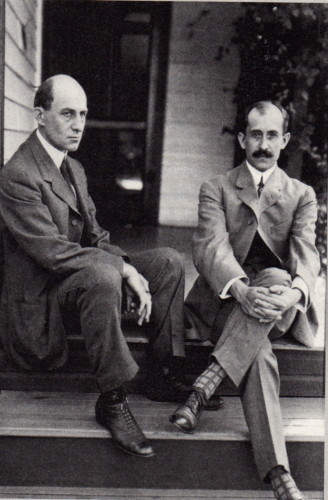 Wilbur Wright, on the left, & Orville Wright, on the right, 1909, seated side by side on the back porch steps of the Wright family home at 7 Hawthorn Street, a small side street on the west end of Dayton, Ohio. Wilbur was 42 here & Orville 38. Wilbur, lost in his serious looking, genius thoughts, is dressed in his usual plain dark suit & high-laced shoes. Orville, the mechanic of the two, is in a lighter-toned, better tailored suit, with snappy argyle socks, & wing tip shoes.